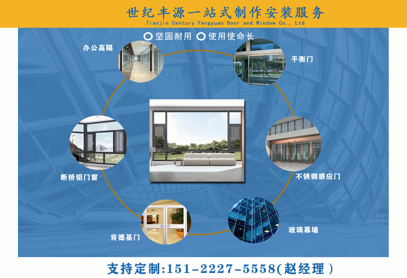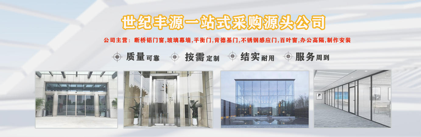 天津世紀(jì)豐源門窗有限公司從事斷橋鋁門窗,玻璃幕墻,平衡門,肯德基門,不銹鋼感應(yīng)門,百葉窗,辦公高隔,制作安裝一站式訂制生產(chǎn)及配套服務(wù)等。 公司自成立以來,始終堅(jiān)持以人才為本、誠信立業(yè)的經(jīng)營原則,薈萃業(yè)界精英,成熟的技術(shù)、管理方法及企業(yè)經(jīng)驗(yàn)與國內(nèi)企業(yè)的具體實(shí)際相結(jié)合,為企業(yè)供給各個方面的解決方案,使企業(yè)在激烈的市場競爭中始終堅(jiān)持競爭力,實(shí)現(xiàn)企業(yè)快速、穩(wěn)定地發(fā)展。 質(zhì)量好、服務(wù)好、才能信譽(yù)好,公司已在諸多領(lǐng)域取得輝煌成績,愿意成為您可信賴的長期合作伙伴?! ∽屛覀償y手同行,共同實(shí)現(xiàn)“讓普通老百姓都用得上高端門窗”...